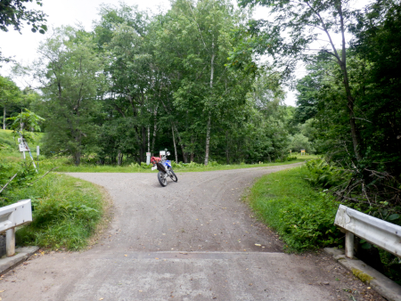 さらに進んでいくと、やがて右手の木立の向こうから足寄川が近づいてきます。その後、ダートは足寄川の流れに寄り添いつつ穏やかな雰囲気に包まれて進んでいきますが、険しさの感じられない穏やかさの理由は、ここが1960(昭和30)年まで存在していた足寄森林鉄道の軌道跡であることに由来するのかも。北海道の林道ではよくある話です。 |