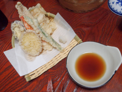 天ぷらのタネはエビ、キス、インゲン、カボチャ、シイタケ、サツマイモだったかな。