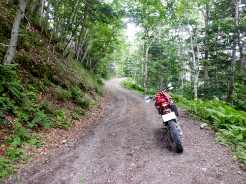 北の茂足寄川と南の螺湾川とを隔てる山中をこまめにガーブしながら登り詰めていき、周囲には鬱蒼とした森が広がるだけで眺望は望めず、「峠」というほどでもないですが、やがて標高360mに達するとダートは下り坂に転じます。ここで路面は土質っぽく変化しますが、走りやすさにこれといった変化は感じられなかったです。 |
