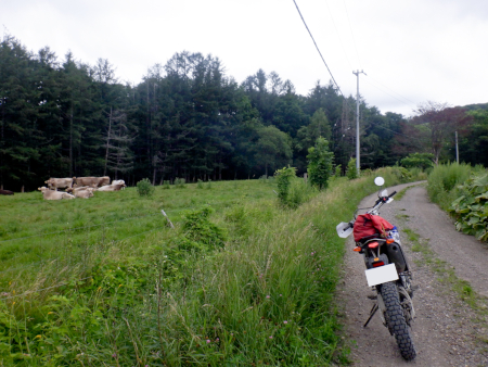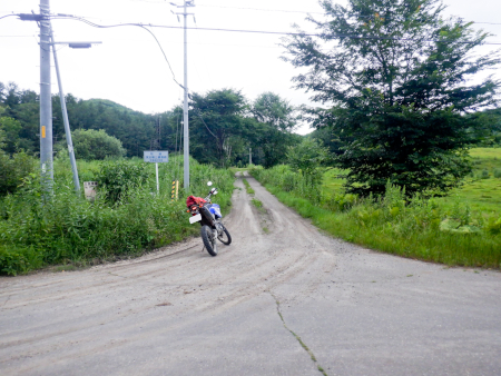 正確には起点ではなくて終点から町道茂足寄上螺湾線に入線させていただきますが、嬉しいことに路面は入口からすでにダート状態。まずは乳牛さんが群れてまどろむ牧草地を横目に前方に広がる森に向かって進んでいきます。