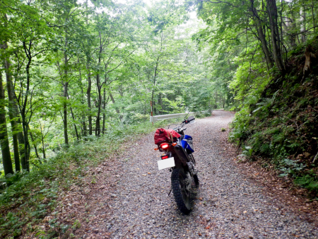 その後、ダートは小砂利質に戻り、小気味良くカーブを繰り返しつつの下り坂が続きます。路面には砂利が補充された痕跡が見られましたが、町道茂足寄上螺湾線が上螺湾茂足寄林道だった頃もこれほどの路面維持が行われていたかについては不明。厳密には「林道」でないことは残念ですが、それでも町道だからこそ保証された走りやすさにだけは感謝! |
