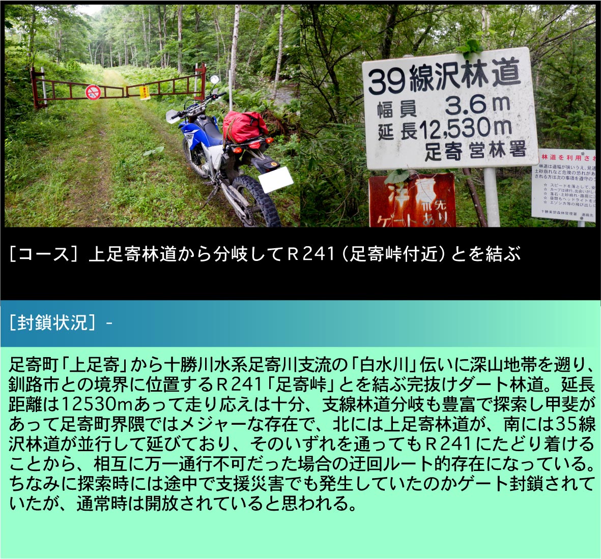 | (1)上足寄林道からの分岐地点。左に向かう上足寄林道に対して右に向かうのが39線沢林道 (2)アプローチがより簡単なR241側の入口 |