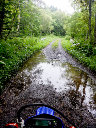 雨上がりの林道ではお約束の水溜りが出現。そのまま気にせずジャババと突っ込んじゃえばいいのだけど、減速しないと足回りやブーツが泥だらけになるのが意外とストレスだったりしますが、今回はその対策として秘密兵器を装備してきたので大丈夫! |