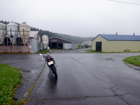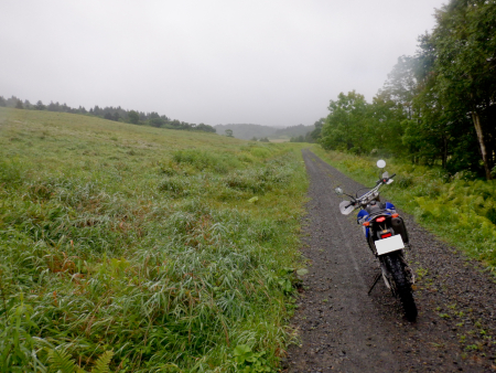 その後も森の木々しか視界に映らぬ鬱蒼とした森の中を進んでいきますが、やがて道すがらに森の中に切り拓かれた牧草地が現れてきます。そのすぐ傍を抜けていくダートは徐々に開放的になってきますが、ここで小雨が降り出してしまいました。しかし、出発前から予期して事前にレインウェア&ゴム長を装着しているので別に慌てません。
