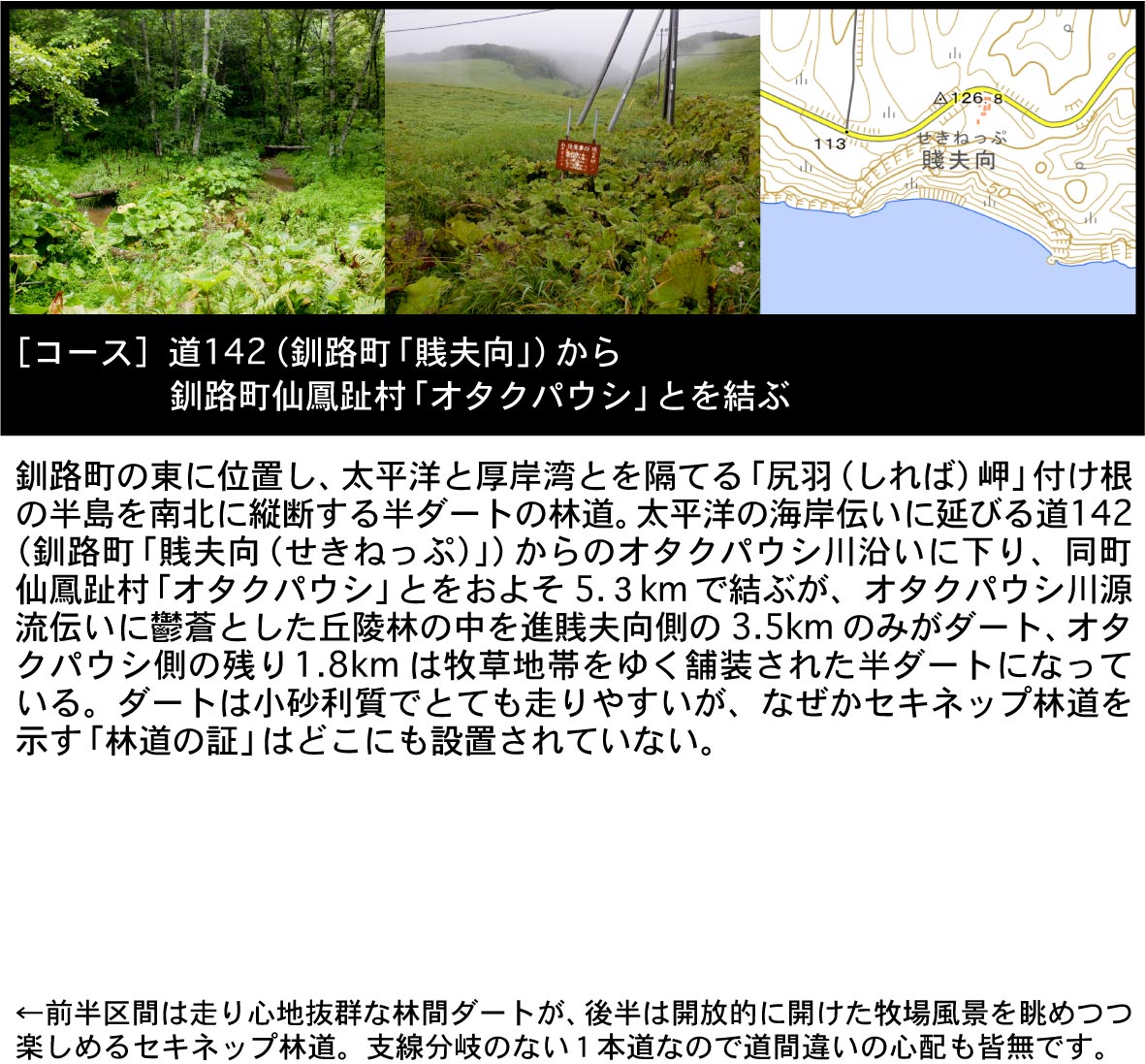 ート終了地点から先にも道は続き、5.4kmで釧路町仙鳳趾村「オタクパウシ」で左右に延びる町道に突き当たりますが、ここがセキネップ林道の終点なのか、それともダート終了地点が終点なのかについては不明。そしてやはりというか、この地点にもセキネップ林道を示す林道標はやはり存在していませんでしたが、当サイトでは独断でこの地点を終点としておきます。ちなみに突き当たりを左折すると行き止まりですが、右折すると3.5kmで道142に、4.9kmでR44へと至り、さらに5.1kmでJR根室本線「尾幌駅」にたどり着けますが、セキネップ林道へのアプローチは海側の道142側からの方が格段に分かりやすくておすすめです。 → 探索終了! |