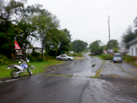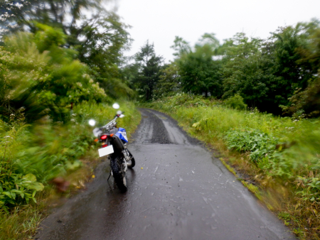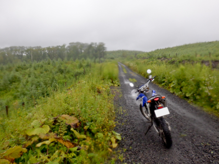 広大な根釧原野の牧草地帯を軽いアップダウンで進んでいきます。雨は霧雨が降ったり止んだりの状態でしたが、ダートは路面維持がよくなされているらしく、水捌けの良い小砂利質の雨天直後でも泥まみれに陥ることはなかったです。 |