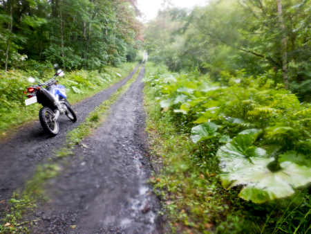 霧雨が降ったり止んだりを繰り返し、幻想的な趣が強く漂う森の真っただ中にひたすら続く塘路林道のダート。林道から一歩でも外れたら速攻遭難しそうな道すがらの原生林じみた森はちょっと怖い雰囲気ですが、しかし、路面状況は荒れ、ガレ知らずでいたってまともだったです。今時は国有林林道だって草ボーボーに陥っていることが多いのですが、その理由はこの辺りの森が「王子製紙(株)」の社有林担っているから? → さらに塘路林道を進む! → 探索終了! |