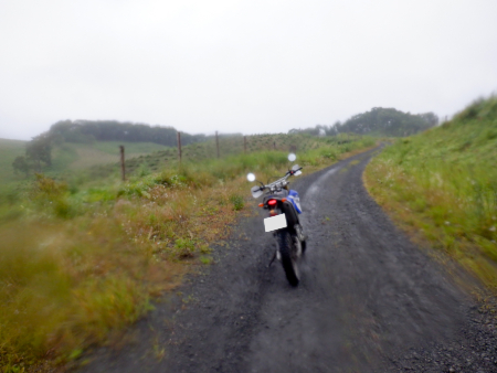 いざ塘路林道のダートに乗り込むと、すぐに入線直後の森を通り抜けて広大に開けた牧草地帯に抜け出しました。生憎と霧雨が降る空模様につき爽快さは感じられませんでしたが、それでも周囲はこの広さ! 雨の日ならではの水墨画チックな雰囲気と共に、いやが上にも開放感が存分に味わえてしまいます。