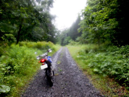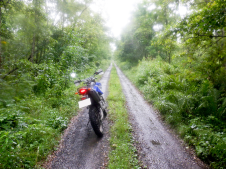 うげぇ・・・。ダートは砂利質につき水捌けが良いため雨降りの日にしては快適に進んでこられましたが、ここで巨大な水溜りに遭遇。まだ林道駆け出しであった若かりし頃ならば、水しぶきや泥汚れを厭わず猪突猛進したものですが、あはは、さすがに現在は歳を重ねて臆病になったのか、少しでも泥跳ねしないように牛歩の歩みで通過します。 |