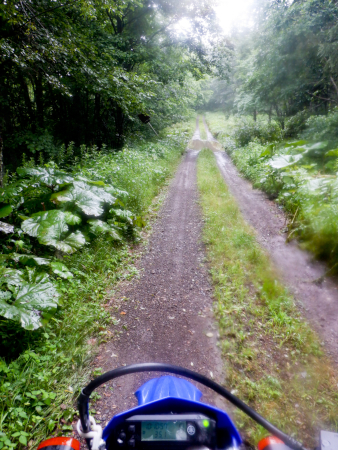 最奥の民家の傍を通り抜けるといよいよダートが開始します! さすがに集落内は舗装されていましたが、集落外れの森の際で路面は唐突に砂利ダート化して森の中へと向かっていたんだよな。小雨がシトシト降りな状況でしたが、躊躇することなくゴー! ちなみに路面は厳密には全線ダートではなくて、集落内の区間のみ舗装されていました。 |