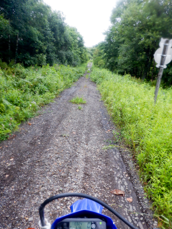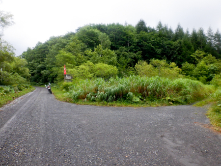 支線林道には相応しくない高規格なダートをんでいくと右折分岐が現れ、それと同時にダートの高規格な状態もここで終了。というわけで「右折側は?」と思って眺めてみると、路肩の藪に埋もれて「茅沼総合農園」の看板がありましたが、どうやら右折先は農業生産法人の敷地になっているみたいでした。もちろん用はないのでそのまま通過です。 |