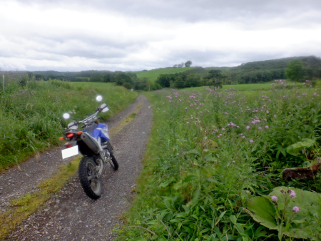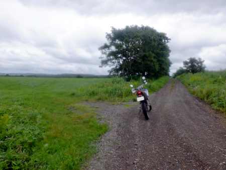 軽いアップダウンのみで坂らしい坂もなく、広大な牧草地が広がるこのシチューションは北海道の林道ならでは! シラルトロエトロ川の南、一面の牧草地帯を行くシラルトロ支線林道のダートを気持ち良くWRを進めていきますが、この辺りも入植が始まる以前、まだアイヌの人たちが暮らしていた昔は鬱蒼たる原生林に覆われていたのだろうなぁ。その名残りを彷彿とさせる森の一部が広大な牧草地帯のあちこちに点在しています。