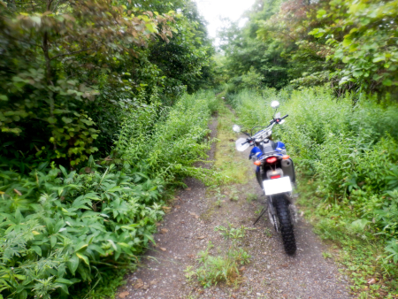 行きがけに見かけた右折分岐ダートに入りましたが、ちなみにここは地理院地図上では延長距離2.9kmほどのピストンとして記されています。そして分岐直後の350mほどは車道を示す実戦で、その先は幅員1m以下の徒歩道を示す波線で記されているのですが、そのような状況を示すかのように、ダートはすぐに草深くなってきます。 |