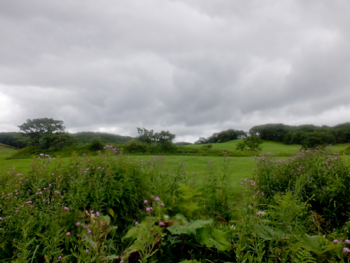 林道の右手には起伏した牧草地帯の丘が広がります。