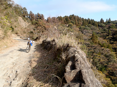 | 誰もいない秋の林道の静けさの中、落ち着いた雰囲気のダートをゆっくり登坂していきます。中盤以降、道すがらにひときわ大きな葉で黄葉するダンコウバイの木をよく見かけましたが、枝を大きく横に延ばしているので、そういう地点では路面にダンコウバイの黄色く染まった大きな葉がたくさん落ちていました。 | |||||