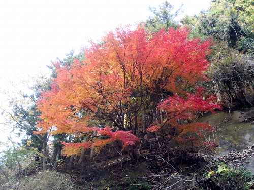 | 集落内の里山区間をゆっくり進んで富津市域に入って「中沼」集落の外れまで進んできました。そこでダートはいったん途切れて山林内へと分け入る登り坂が開始しますが、路肩の薮に紅葉したモミジが点在していました。この辺りではなに気ない風景の中で、ごく当たり前のようにモミジが真っ赤に紅葉しています。 | |||||