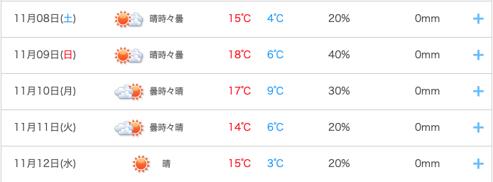 続いて確認しておくべきことは紅葉林道ツーリング中の天候。日程は11月9日〜12日を予定していますが、矢板市の1週間前時点での天気予報はおおむね晴れとのこと。これならば探索期間中は秋晴れの林道探索が期待できそうです!