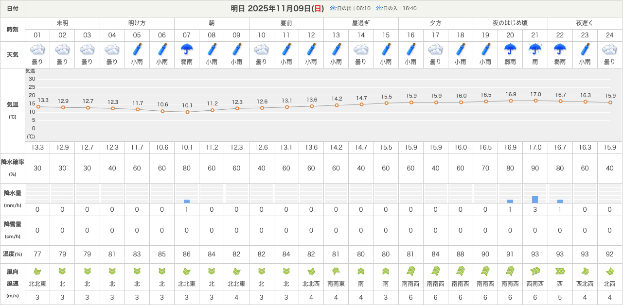 しかし、それはちと考えが甘かった。出発前日の予報では初日の天気が雨時々曇りに変わっているじゃやないですか! なお、初日は夜明け前の午前3時に自宅を出発して高速移動で現地入りする計画でしたが、1時間予報を見てみると・・・。