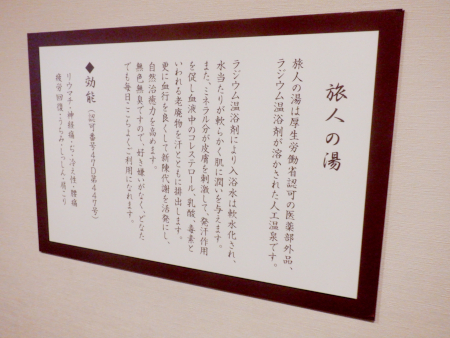 旅人の湯は厚生労働省認可の医薬部外品、ラジウム温浴剤が溶かされた人工温泉です。 ラジウム温浴剤により入浴水は軟水化され、水当たりが柔らかく肌に潤いを与えます。 また、ミウネラル分が皮膚を刺激して、 発汗作用を施し血液中のコレステロール、乳酸、毒素といわれる老廃物を汗とともに排出します。 更に血行を良くして新陳代謝を活発にし、自然治癒力を高ます。 無職無臭ですので、好き嫌いがなく、どなたでも毎日ここちよくご利用になれます。 効能(認可番号17D第447号) リウマチ・神経痛・ぢ・冷え性・腰痛・疲労回復・うちみ・しっしん・肩こり |