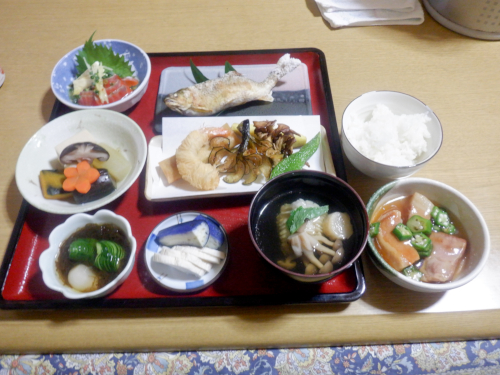 そしてその直後に運ばれてきた小滝鉱泉の夕食ですが、これは凄げぇ! 宿のご主人は京都の料理人のもとで修行されたとのことで、出される夕食も普通の田舎料理ではなくて、包丁人たるご主人が腕を振るった本格的な日本料理なんだよな。 というわけでこの日の献立は以下の通り。 イワナの塩焼・湯葉とサーモンのカルパッチョ・天ぷら・野菜の煮物・豚の角煮 らっきょうもずく酢・イワナのお吸い物・お新香・白いごはん |