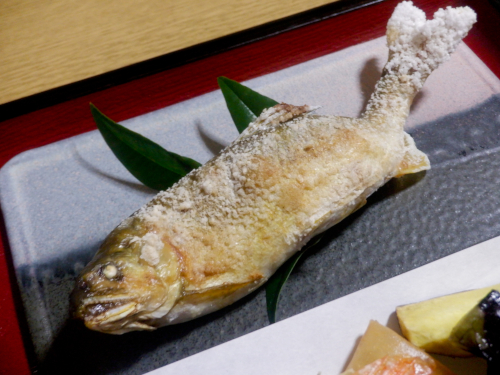 メインディッシュはなんといっても「アユの塩焼き」です! 食欲を誘ってやまぬ香ばしい香りと共にうっすらキツネ色に焼き上がった焦げ目も見目麗しく、塩の振り加減も申し分なし! むしゃりとかぶりつくと最高に美味であり、骨と尻尾と頭だけ残してホロ苦い内臓も含めて全部食べちゃいました。