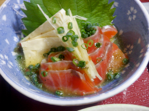 サーモンの鮮やかな赤と湯葉の檸檬色、そして青シゾの緑が見た目にも美しい「湯葉とサーモンのカルパッチョ」です。千切り生姜が添えられ、また細かく刻んだ青ネギが散らしてあり、ほどよい爽やかな酸味が効いてマジ美味かったなぁ!