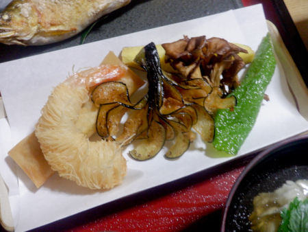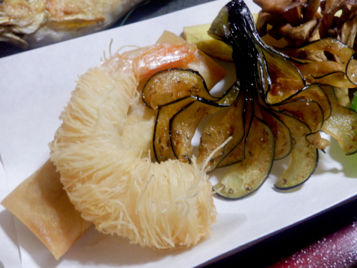 続いて日本旅館では定番でありお約束の「天ぷら」ですが、タネはエビ、ナス、ピーマン、舞茸、サツマイモだったかな。でも衣で揚げていないので素揚げみたいな感じですが、たしか塩を振って食べたような気がします。揚げたてのサクッとした食感で美味しかったですが、しかし、エビとナスをよく眺めてみると・・・。