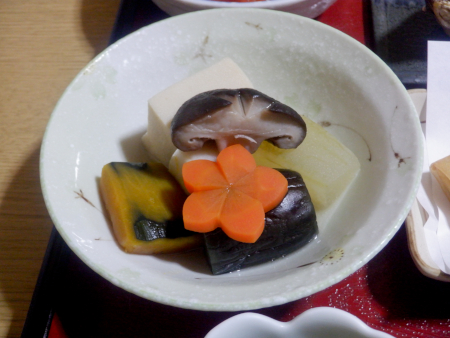 シイタケとカボチャ、ニンジン、ナス、サトイモなどの野菜を優しく炊き上げた「野菜の煮物」。野菜に出汁がよく染み込んだ心温まる一品です。昔、田舎のおばあちゃんの家で食べた煮物を思い出しちゃいました。