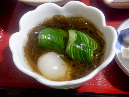酢の物は粒デカならっきょうが1個入った「らっきょうもずく酢」でしたが、ここにもご主人の包丁人としての技が! なんとキュウリが超極薄に蛇腹切りされているじゃないですか! モズクのつるんとした喉越し食感と、キュウリのシャキシャキ感、そしてらっきょう酢のほんわかと甘味のある程良い酸味が最高でした。
