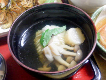 イワナの切り身とシメジ、山芋の切り身が入った「イワナのお吸い物」。川魚の旨い出汁をそのままストレートに味わう上品なお吸い物ですね。