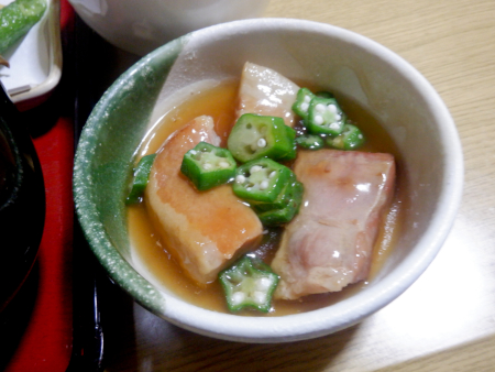 続いての一品はまさかの「豚の角煮」。箸で崩れるほどホロホロに煮込まれた角切り豚バラ肉にオクラを散らした餡がかけられていますが、白米との相性は抜群! 肉は中までしっかりと味が染み込んでトロトロでした!