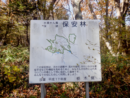 分岐に林道標は設置されていませんが、その代わり「水源かん養保険保安林」看板が立っています。2005(平成17)年に設置されたものなので記載情報は古く、林道名も未記載ですが、一応「現在地」が記載されてます。でも大雑把過ぎるため、これを眺めて自分のいる場所が完璧に把握できる者はいないと思いますけど・・・。