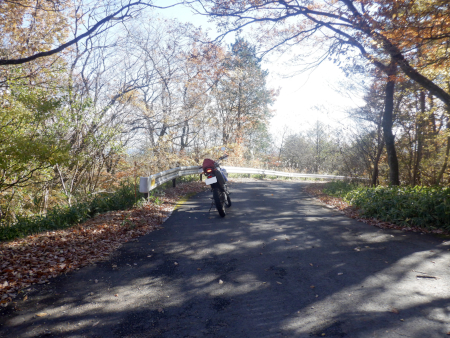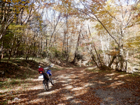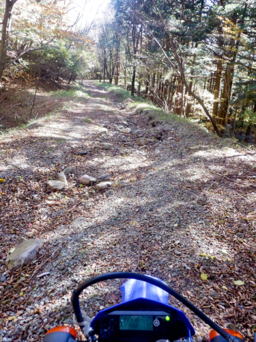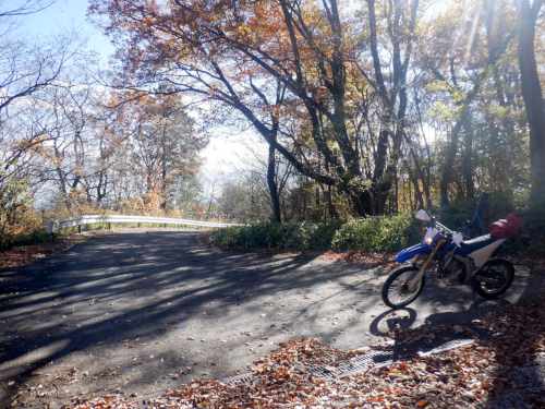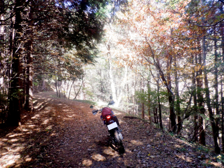 分岐を直進して引き続き紅葉を眺めつつ尚仁沢林道探索を続行しますが、終点までの残り区間は余すところ1.6km。ラストスパートでガンガンにダートを進んでいきますが、ここ、相変わらず落ち葉が凄いことになっていました。