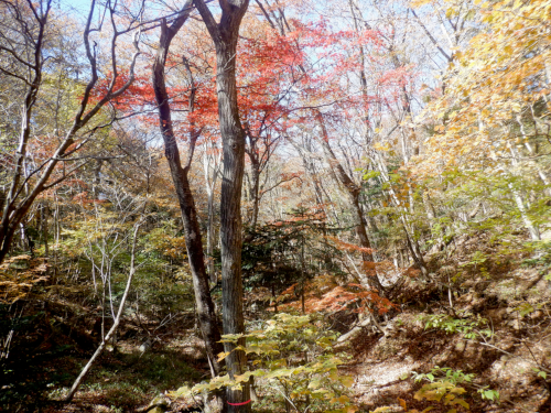 ミツモチ山の南麓、標高800mほどの高さまで徐々に登り詰めたら、その後は穏やかな雰囲気に包まれた森の中を、等高線をなぞるように西から東に向かって進んでいきます。秋山の寒さもこれっぽっちも感じることもなく、昨日の雨が嘘であったかのような最高の紅葉探索日和になりました。