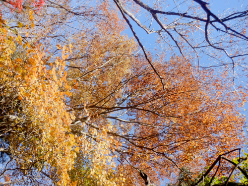 林道の上空を覆う木々の梢もこの通り。黄色から褐色へのグラデーションが澄んだ蒼空に素晴らしく映え、心が洗われるような最高の鮮やかさです!
