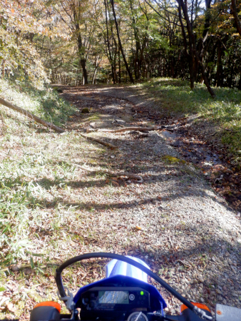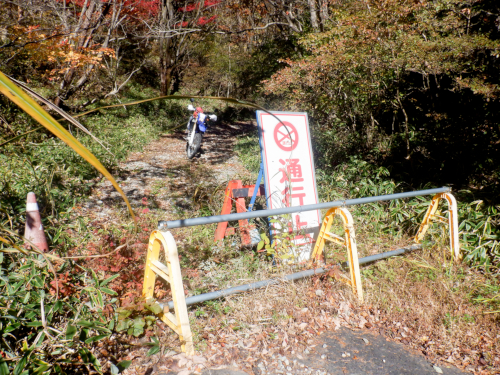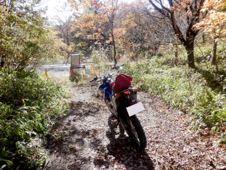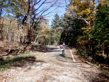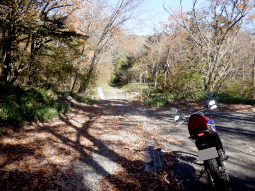 道すがら紅葉が美しかった尚仁沢林道ダート区間ですが、残念ながら途中数ヶ所において虫食い舗装区間に遭遇。どれも極短ですぐにダートは復活していましたが、こんなところにまでアスファルト舗装なんて要らねーぜ!