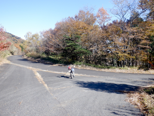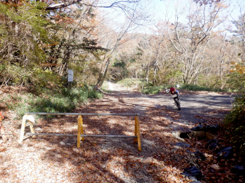登山道発見! 落ち葉まみれで多少ズルズル気味であったダートを進んでいくと、やがて左の斜面を登っていく登山道入口が現れました。各地の林道を探索しているとたまに遭遇しますが、どうやらここで林道が登山道を横切っているみたいでした。 ちなみにこの登山道入口ですが、正確には登山道ではなくて「展望コース」と命名されたハイキングコースだとのこと。県民の森キャンプ場からミツモチ八方林道がダート化する地点にあった第2展望台へと至るコースらしいですよ。しかし、絶好の紅葉日和だというのに訪れるハイカーの姿は皆無だったけどさ。 |