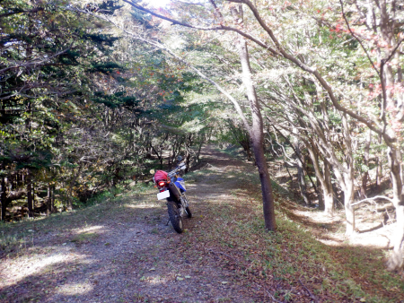 終盤区間で楽しく荒れていた尚仁沢林道でしたが、クレバス区間の次は伸び放題な木々の梢のトンネルが出現! 身を屈めないとメットに梢がぶち当たる地点もあり、おかげで車上での前屈姿勢を強要されましたが、顔面にビシッと木の枝がまともに当たるとかなり痛いというか、けっこう危険ですよ〜。
