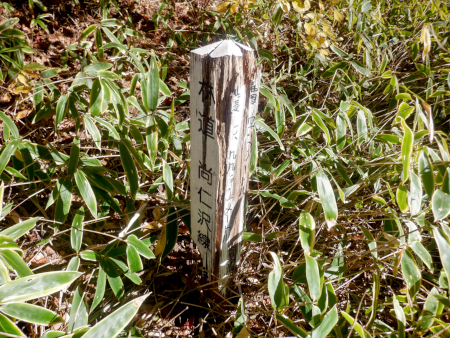 してやったり! まさかとは思いましたが、路肩の藪に埋れた尚仁沢林道を示す貴重な木杭タイプの林道標を発見しちゃいました! 林道標ハンター冥利に尽きる瞬間でしたが、ついでながら述べると、この手の木杭タイプの林道標の良いところは必ずといってよいほど延長距離が記載されていること。 これにも尚仁沢林道の延長距離が記載されていましたが、しかし、残念! 風雨にさらされ続けて木杭はボロボロに腐食して判読不可状態に陥っており、記載された貴重な林道データはすでに失われていたんだよな。 |