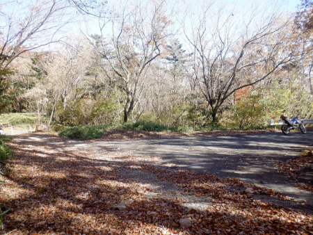尚仁沢林道から乗り継いで蛇行しつつ坂道を下っていくと、すぐに「全国育樹際記念緑地」に至って終点となりますが、終点で振り返るとこんな感じ。アスファルトで舗装された道が全然林道っぽくなくて、すぐそばに東屋が淋しく立っていただけでした。訪れる人の姿はまったくなかったです。