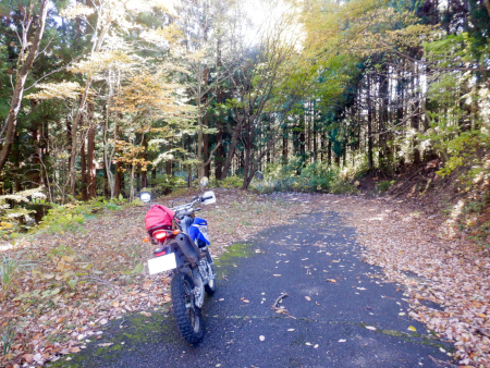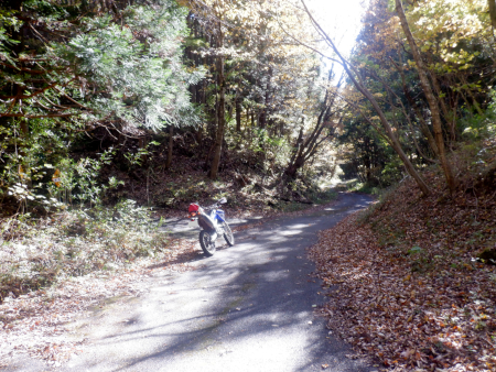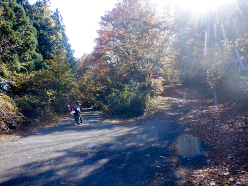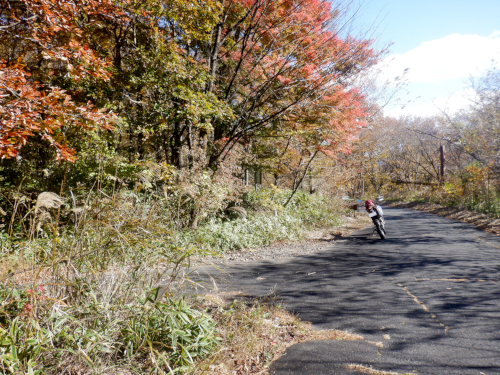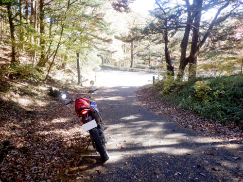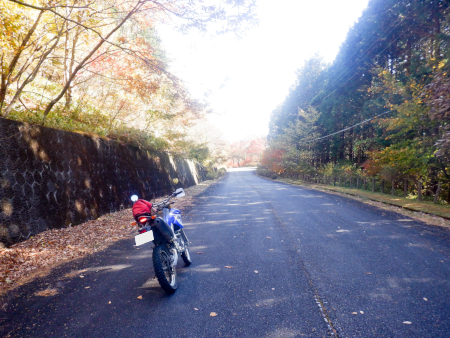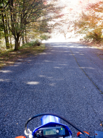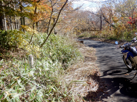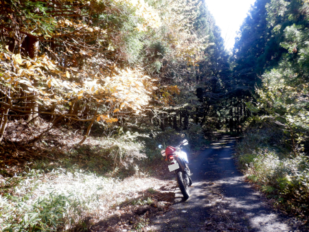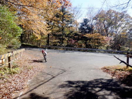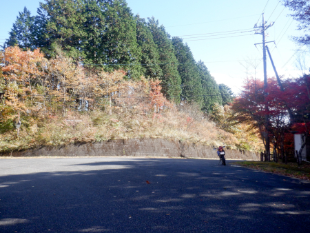 天神林道を引き返して尚仁沢天神林道出口まで戻って来ました。左折すると尚仁沢林道に戻ってしまうので、ここは道なりに右折して天神林道を進みますが、路肩で赤く染まった紅葉がやたらきれいだったなぁ。