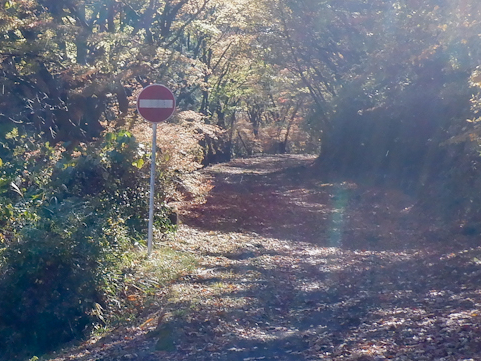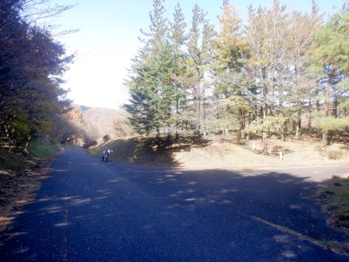 しかし、分岐をよく眺めると一方通行標識が! どうやらここから植樹祭記念緑地公園へは進むことができず、逆に植樹祭記念緑地公園から退出する時にだけ一方通行でに通れるようになっているみたいだな。 ただし、植樹祭記念緑地公園にはもう1ヶ所、栗の木平林道沿いにも入口があるのでわざわざここを通る車もないらしく、路面は落ち葉まみれで放置プレイ状態だったです。でもなぜ一方通行になっている? |