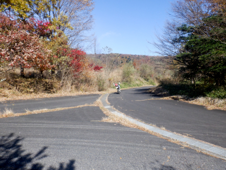 栗の木平林道に入線するとなだらかな下り坂が連続しますが、異様に幅広な2車線舗装はこんな感じ。路面には人為的に消された黄色いセンターラインが確認できますが、起点にヒシ形が立っていなければ、やはり林道には見えませんなぁ。