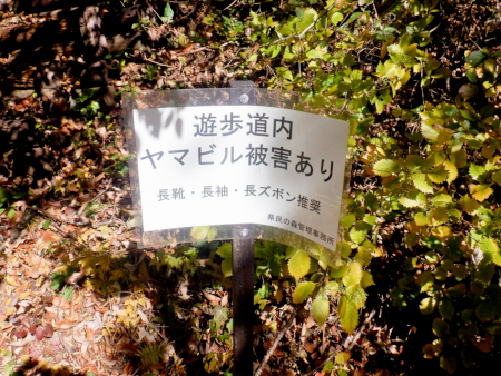 なんと、この近辺はヤマビル生息地らしいですよ! 栃木県では足利市、栃木市、佐野市、鹿沼市、日光市、矢板市、那須塩原市、塩谷町で生息が確認されており、矢板市では新緑の頃の県民の森の遊歩道や、ミツモチ山の登山道などがヤマビルの巣窟になっているみたい。天神林道出口で見かけたハイカー向けの立て札です。