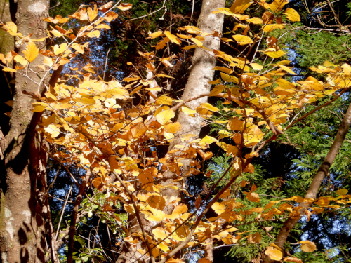 おお、光り輝く山吹色がきれいだぜぇ! 植樹祭記念緑地公園を過ぎた先の林道の雰囲気は暗かったですが、途中で見かけた雑木の黄葉はとても美しかったです。