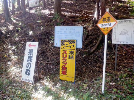 その昔、この辺りは古くから栗の木が多い土地だったので「栗の木」の地名がついたのかどうかは知りませんが、それにしても栗の木平林道は立派過ぎ! 広域基幹林道でもあるまいし、幅員は優に2車線、いやそれ以上あって林道としては不自然なことこの上ないですが、栗の木平林道の道すがらには1982(昭和57)年に昭和天皇・皇后両陛下を迎て開催された第33回「全国植樹祭会場」の会場跡があることから、植樹祭開催時にそのアクセス道として2車線林道に拡張されたくさいな。 ちなみにここ県民の森で開催された第33回植樹祭のテーマは「うえる緑 のびる緑 まもる緑」とのこと。具体的にはスギとヒノキが植樹されたみたいですよ。 |