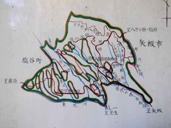 枝持沢林道については林道標が未設置ですが、その代わりに三又分岐地点に「民有保安林」看板が立っているので記載された林道地図を眺めてみました。 しかし、この地図はかなり古いようで、栗の木平林道とミツモチ林道の接続地点は記載されていますが、そこから枝持沢伝いに南下しているはずの枝持沢林道については道筋そのものが未記載になっています。つまり地図が作成された時点では林道そのものがまだ開設されていなかったのかもしれません。 |