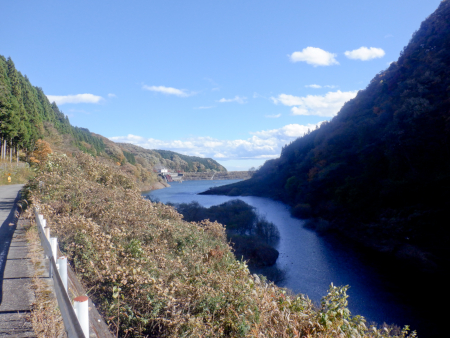 枝持沢林道終点では間の前に寺山ダムのダム湖が広がっています。右岸(画像左岸)伝いに県272が延びていて前方には寺山ダムも見えていますね。林道出口を左折するとあの寺山ダムを経由して矢板市街地に戻れます。