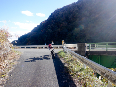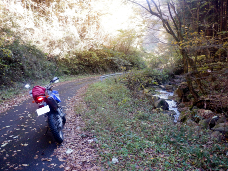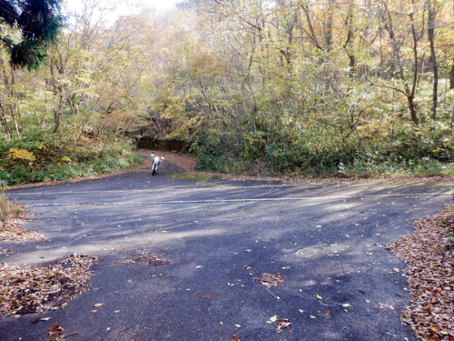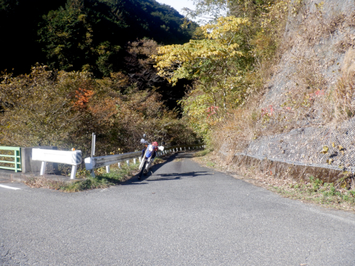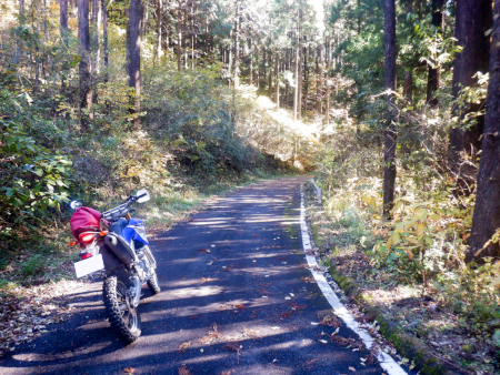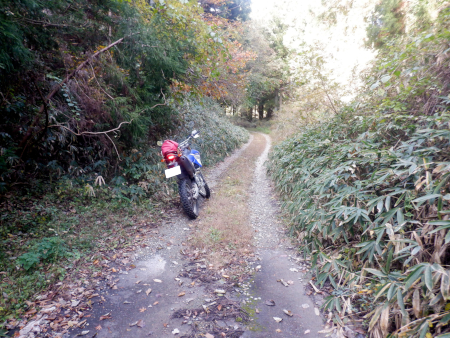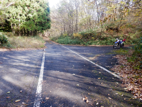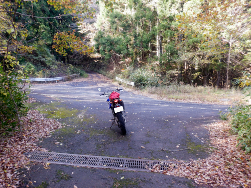 やったー、残存ダート発見! そんな感じで道すがらの紅葉を眺めながら生産の森林道の舗装路を登坂していきましたが、やがてアスファルトが途切れてそこから秋枯れた雑草のワダチダートが開始しているのを発見! 高密度林道密集地帯の林道は100%舗装済みだと思っていたのですが、まさか生産の森林道にダートが残されていたなんて! 当然、一気にテンションが上昇しましたが、やはり林道は実際に走ってみないことには分からんもんですなぁ! |