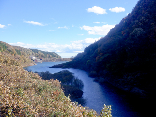 道すがらに期待していた紅葉はほとんど見られず、路面も舗装されていた残念な枝持沢林道ですが、ふと見上げた空は完璧な秋晴れ! 雲一つなく空の青さが目に染み入るようで、その点だけは最高だったけどさ。